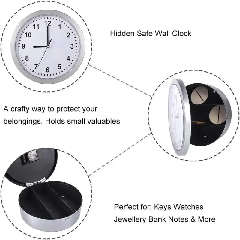 Stylowy zegar retro z cichym mechanizmem i ukrytym schowkiem na gotówkę, biżuterię lub drobiazgi. Elegancja, bezpieczeństwo i funkcjonalność w jednym.